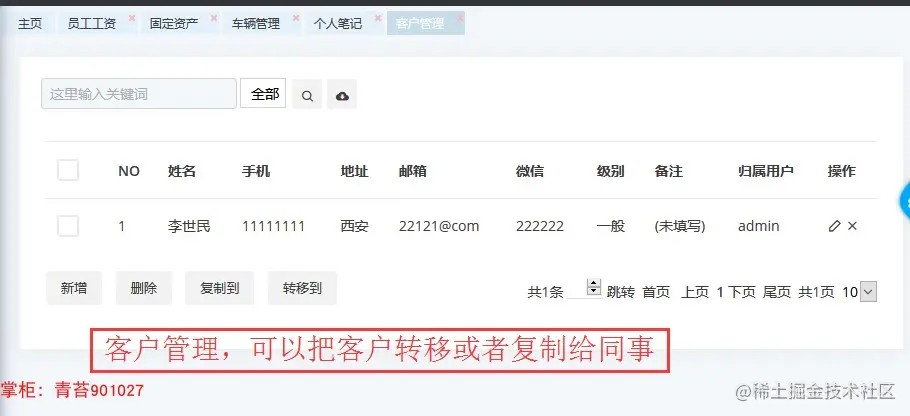 41. 客户管理:维护个人客户资料,可以把自己客户复制、转移给其它用户