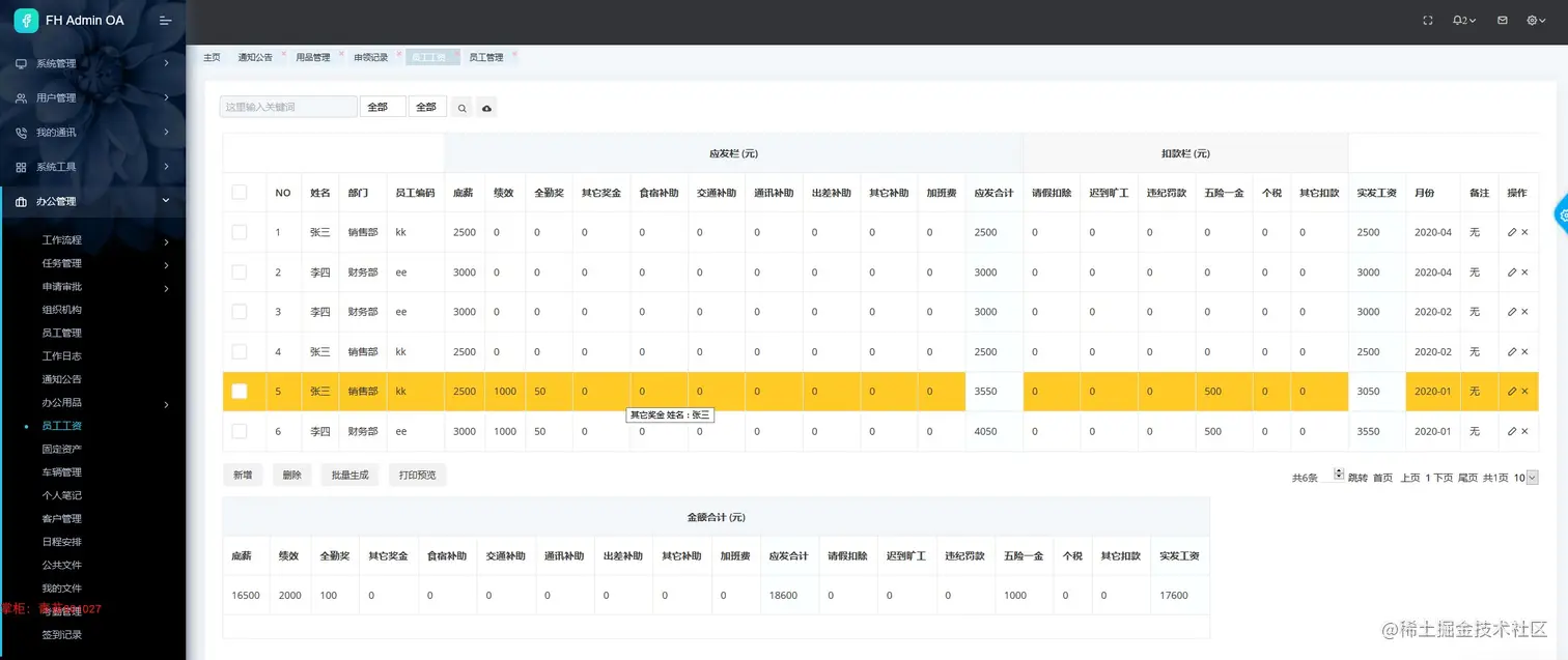 37. 员工工资:根据年月份,单个、批量生成工资单,参考考勤,打印工资单,计算总金额