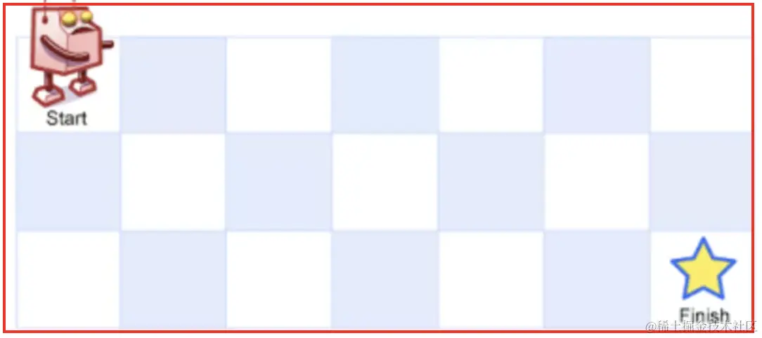 题目:一个机器人位于一个 m x n 网格的左上角 (起始点在下图中标记为“Start” )。机器人每次只能向下或者向右移动一步。机器人试图达到网格的右下角(在下图中标记为“Finish”)。问总共有多少条不同的路径?