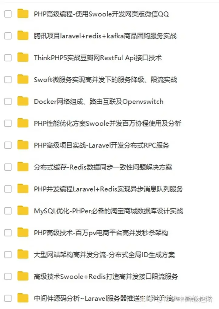 phper在进阶的时候总会遇到一些问题和瓶颈,业务代码写多了没有方向感,不知道该从那里入手去提升,对此我整理了一些资料,包括但不限于:分布式架构、高可扩展、高性能、高并发、服务器性能调优、TP6,laravel,YII2,Redis,Swoole、Kafka、Mysql优化、shell脚本、Docker、微服务、Nginx等多个知识点高级进阶干货需要的可以免费分享给大家,需要请戳这里