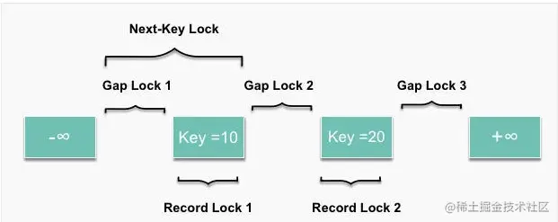 主键值即record,如上图:数据库里有两条数据key为10和20,这就是对应两个记录锁