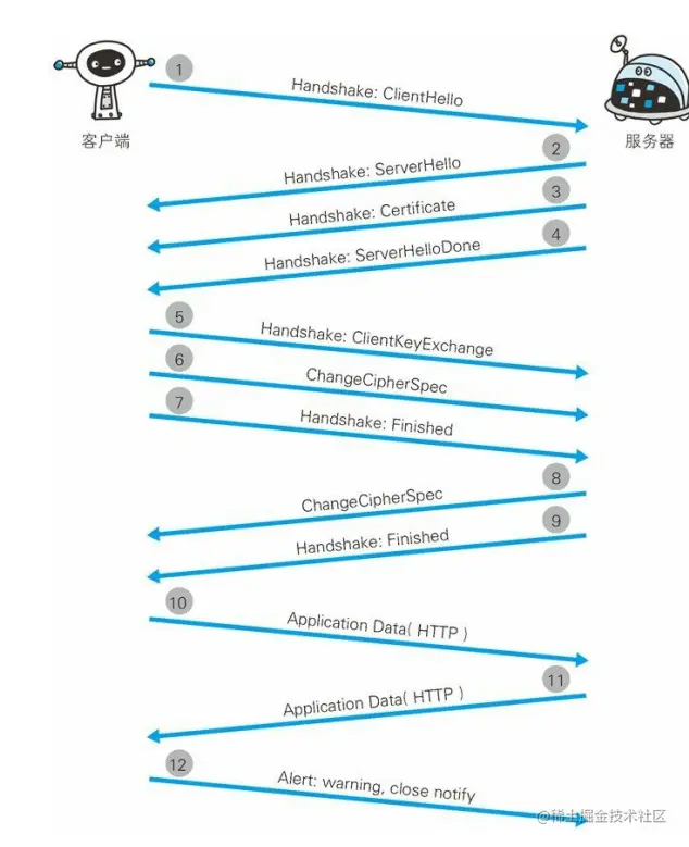 - 步骤12:最后由客户端断开连接。断开连接时,发送close_notify报文。上图做了一些省略,这步之后再发送TCPFIN报文来关闭与TCP的通信。