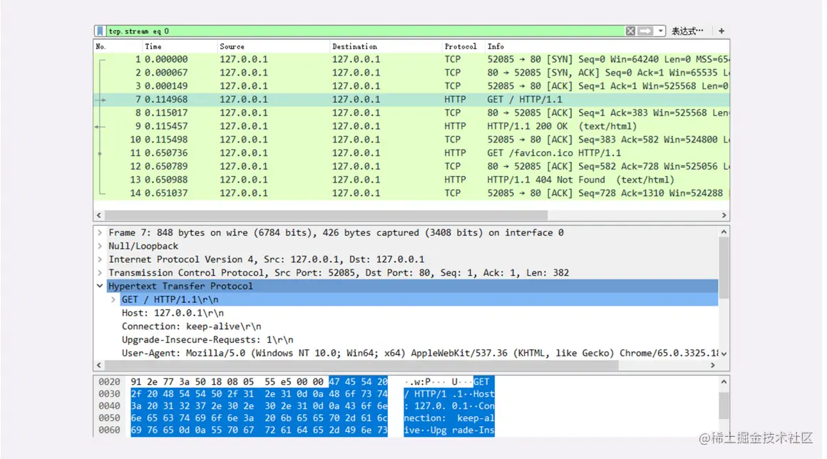 因为我们在地址栏里直接输入了 IP 地址“127.0.0.1”,而 Web 服务器的默认端口是80,所以浏览器就要依照 TCP 协议的规范,使用“三次握手”建立与 Web 服务器的连接。