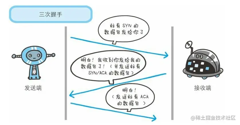 1、发送端发送带有syn标志的数据包; 2、接收端接收后,回传syn/ack标志的数据包以示传达确认信息; 3、发送端回传一个ack标志的数据包,代表握手结束。