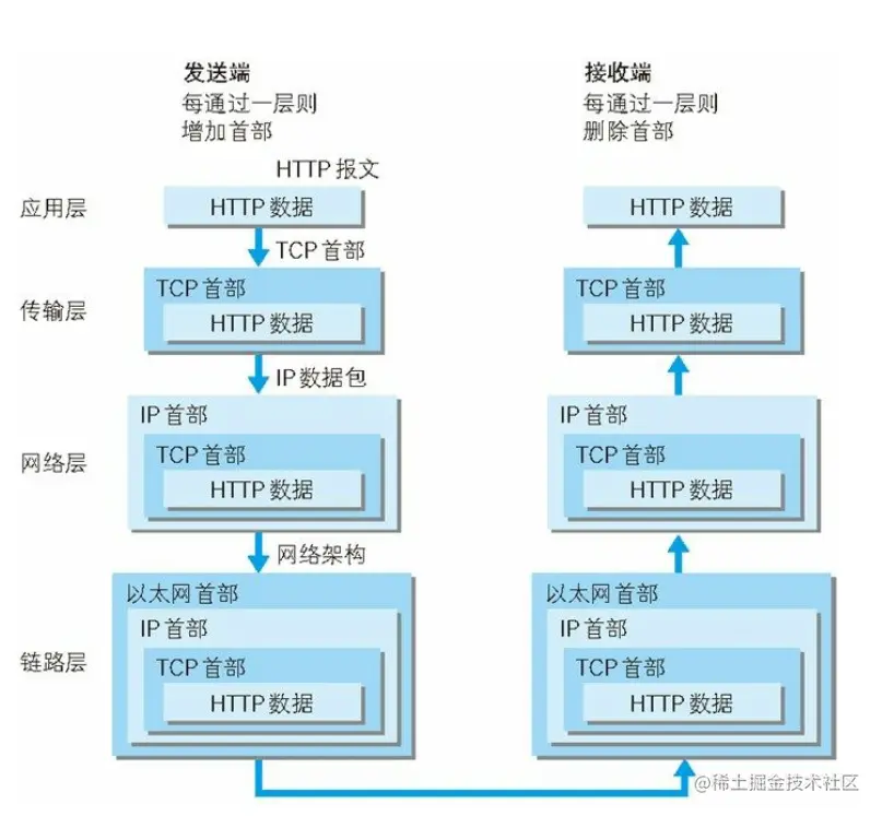 通信传输流 发送端在层与层之间传输数据时, 每经过一层时必定会被打上一个该 层所属的首部信息。 反之, 接收端在层与层传输数据时, 每经过一层 时会把对应的首部消去。