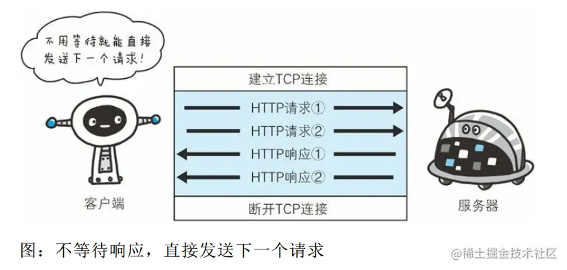 HTTP/1.1 持久连接的特点是, 只要任意一端没有明确提出断开连接, 则保持 TCP 连接状态。 管线化:同时并行发送多个请求, 而不需要一个接一个地等待响应了。