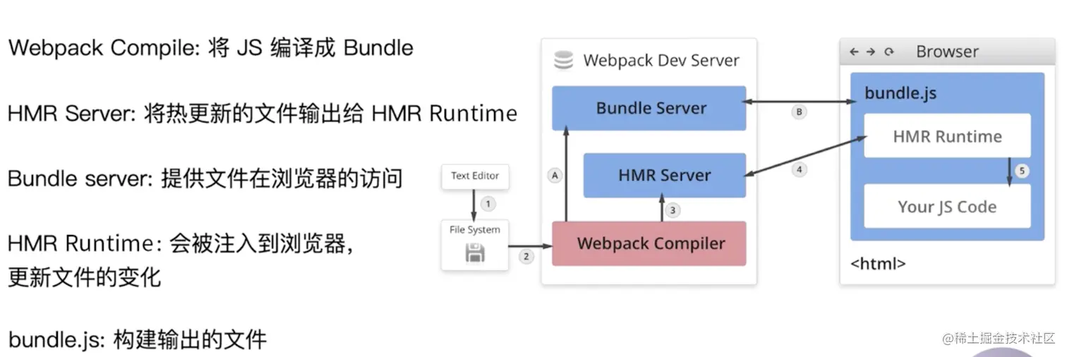 文件系统通过 webpack compile 将代码打包,然后传输给 bundle server,然后浏览器就能访问到我们写的代码了。 -