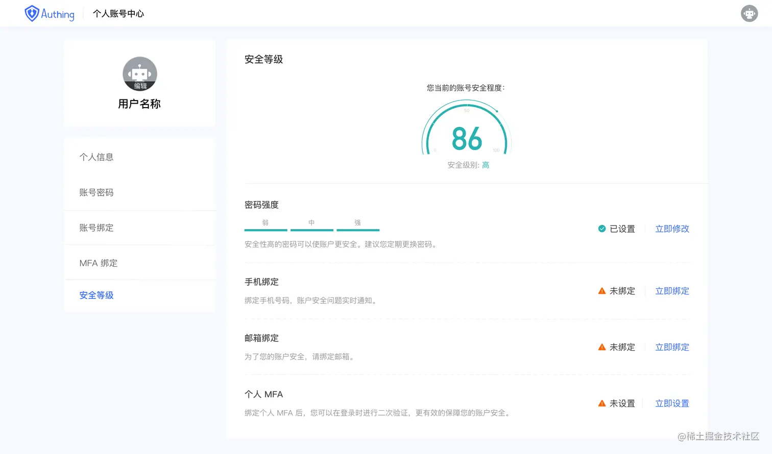 Authing 产品双周动态(1.3-1.16) Authing身份云 2021-01-18 115 阅读1分钟 关注 @Authing 上线完全使用用户自定义数据库的认证模式,可以查看请求的数据库连接和查询日志。 上线个人账户安全等级功能,基于密码强度、邮箱手机绑定情况进行综合评分。 权限交互体验升级,资源定义和权限授权流程更加易用