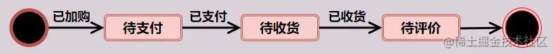 我们如果在网上进行购物的话就会产生订单,不同状态下会有不同的行为,订单状态可分为 加购状态、付款状态、收货状态、评价状态。在整个订单流转的过程中,由不同的事件行为可导致它状态的变更: