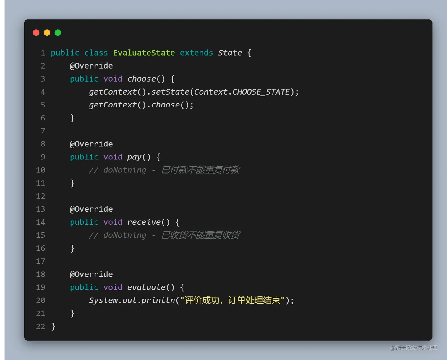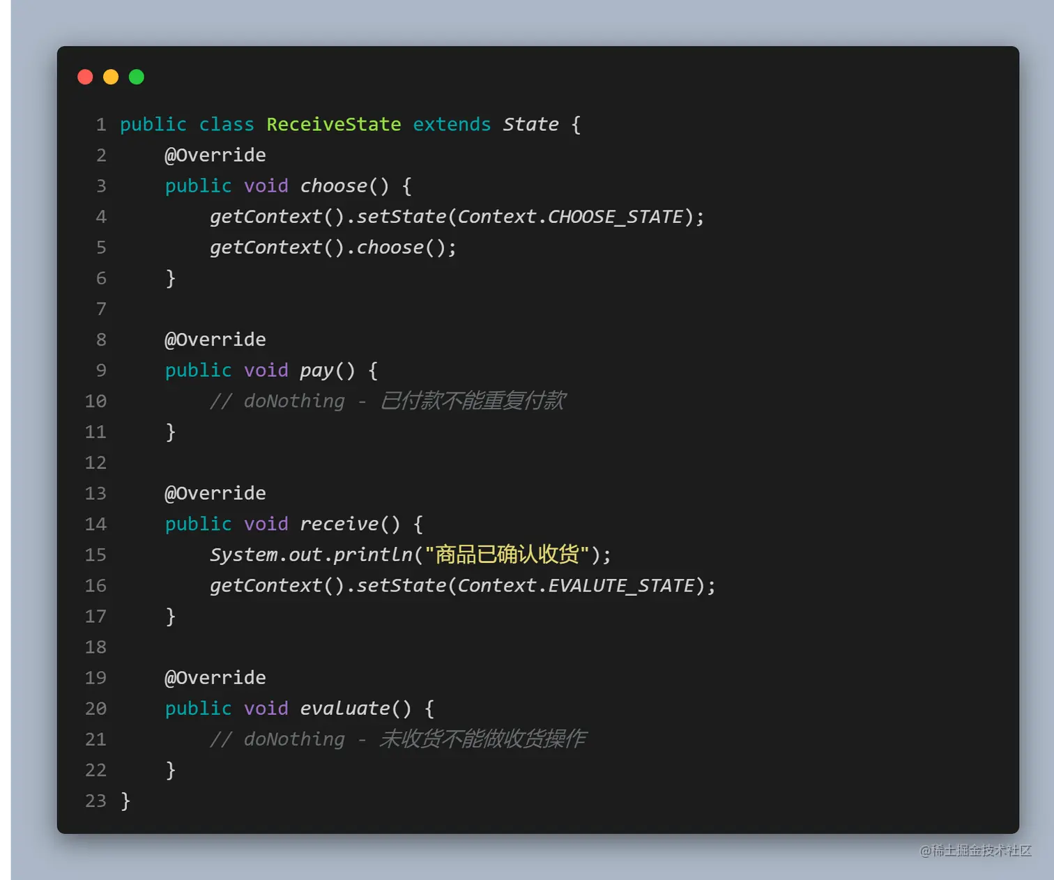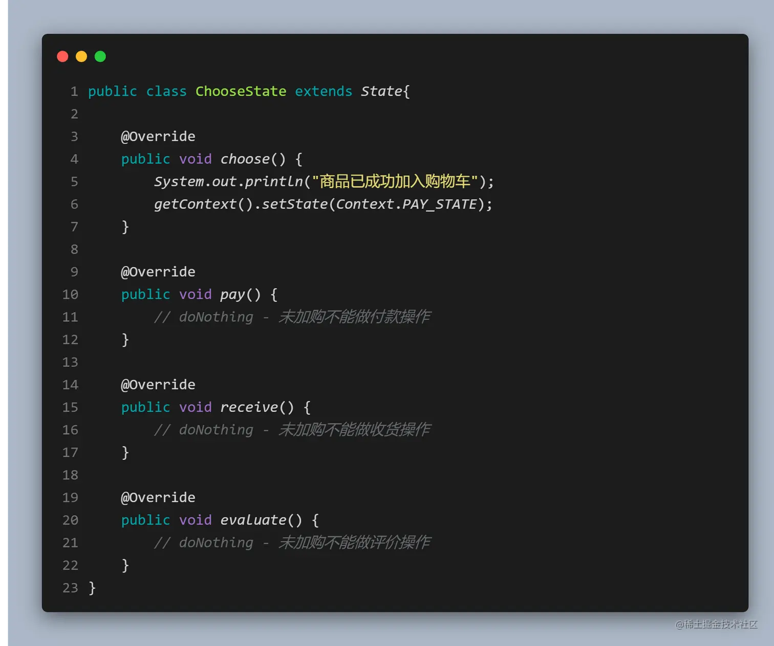- 具体状态(ConcreteState)角色: 实现抽象状态所对应的行为