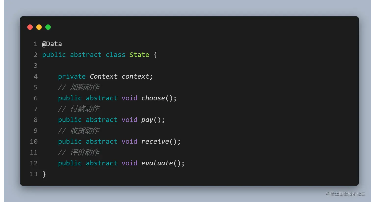 - 抽象状态(State)角色: 定义一个接口,用以封装环境对象中的特定状态所对应的行为