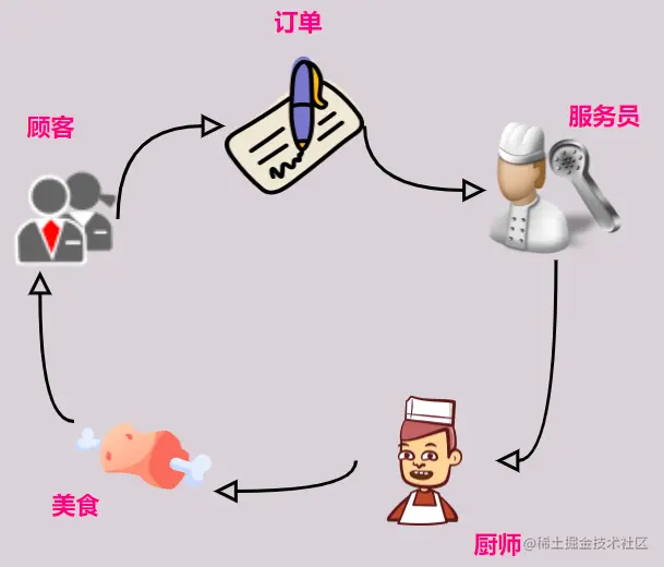 看到这张图我们就会想到我们平时去餐店吃饭的场景:我们需要把我们要点的餐写在订单上,然后服务员拿着订单转去柜台,通知厨师需要出的菜,这个时候厨师根据订单上 的内容将食物备好,最后顾客满意的吃上食物。