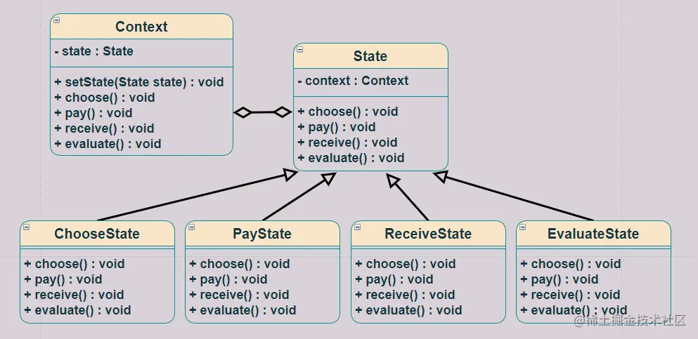 如果遇到状态比较多的情况,用 if else 处理起来比较乱,那么我们可以用状态模式来改进试下,UML 图如下:
