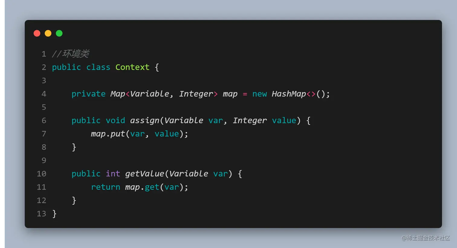- 环境(Context)角色: 通常包含多个解释器需要的数据或是公共的功能,一般用来传递被所有解释器共享的数据,后面的解释器可以从这里获取这些值