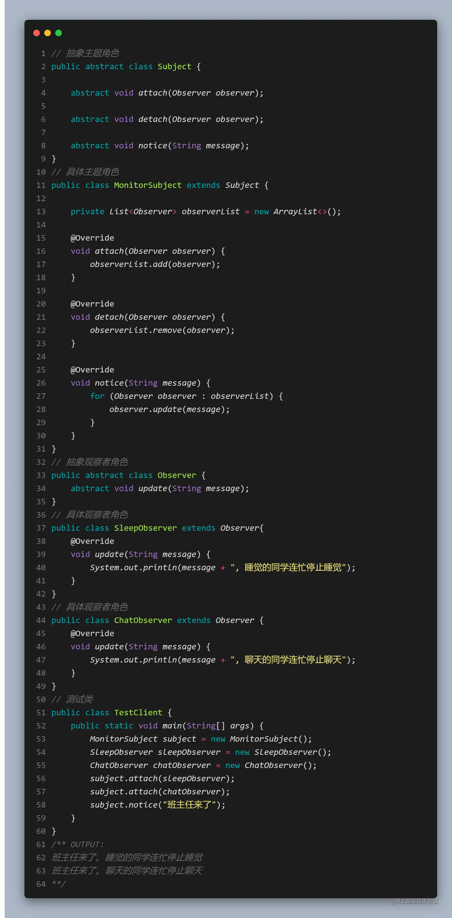 - 对象结构(ObjectStructure)角色: 定义当中所提到的对象结构,对象结构是一个抽象表述,具体点可以理解为一个具有容器性质或者复合对象特性的类,它会含有一组元素(