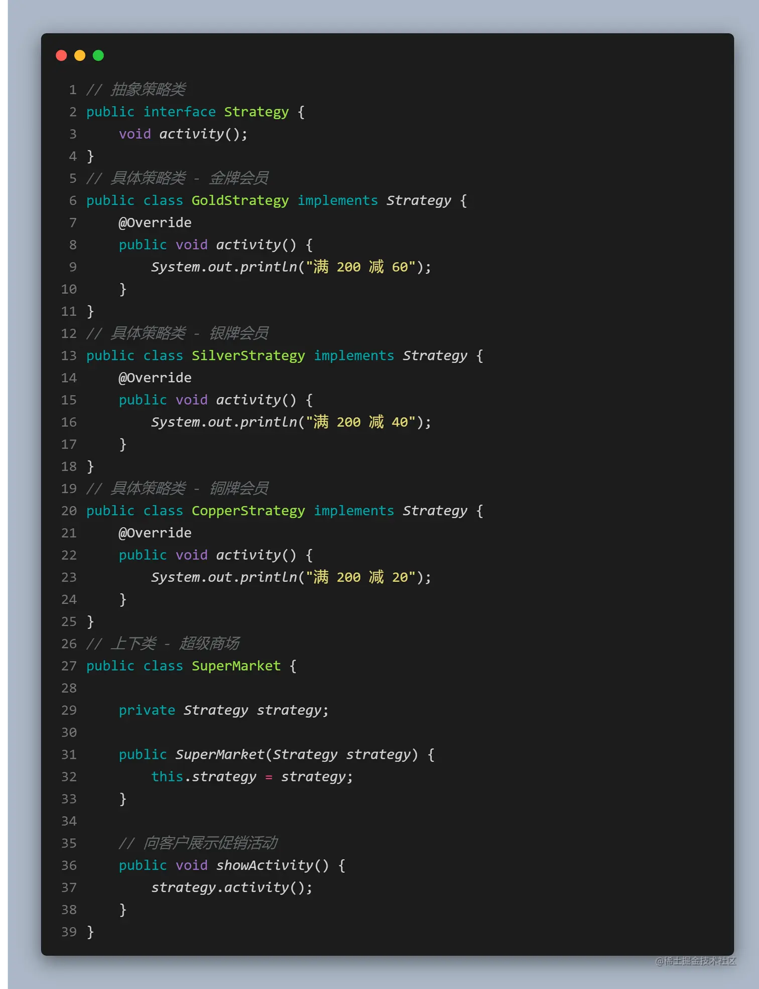 抽象策略(Strategy)类: 这是一个抽象角色,通常由一个接口或抽象类实现,此角色给出所有的具体策略类所需的接口