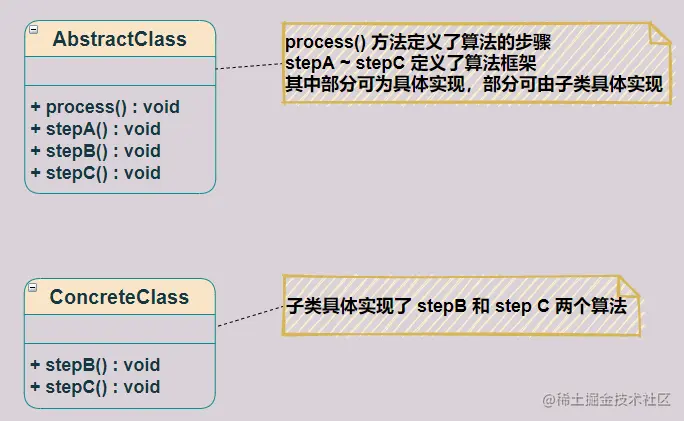 我们顺势根据 UML图 总结下 模板方法模式 中存在的几种角色: