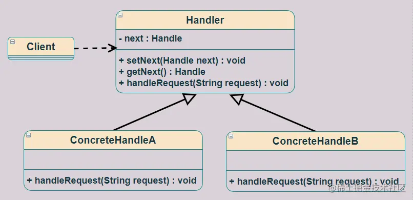 - 客户端(Client)角色: 创建处理链,并向链头的具体处理者对象提交请求,它不关心处理细节和请求的传递过程