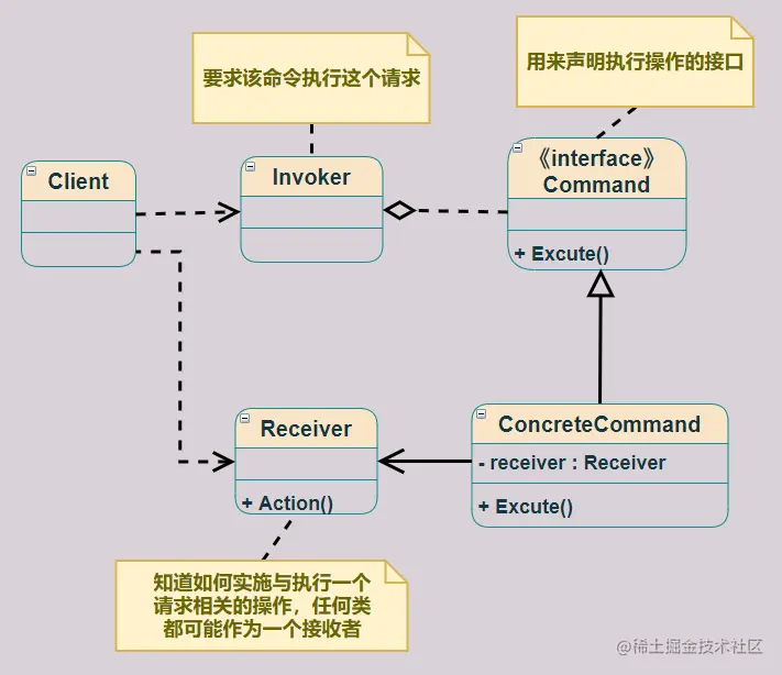 - 实现者/接收者(Receiver)角色: 接收者,真正执行命令的对象。任何类都可能成为一个接收者,只要他能够实现命令要求实现的相应功能