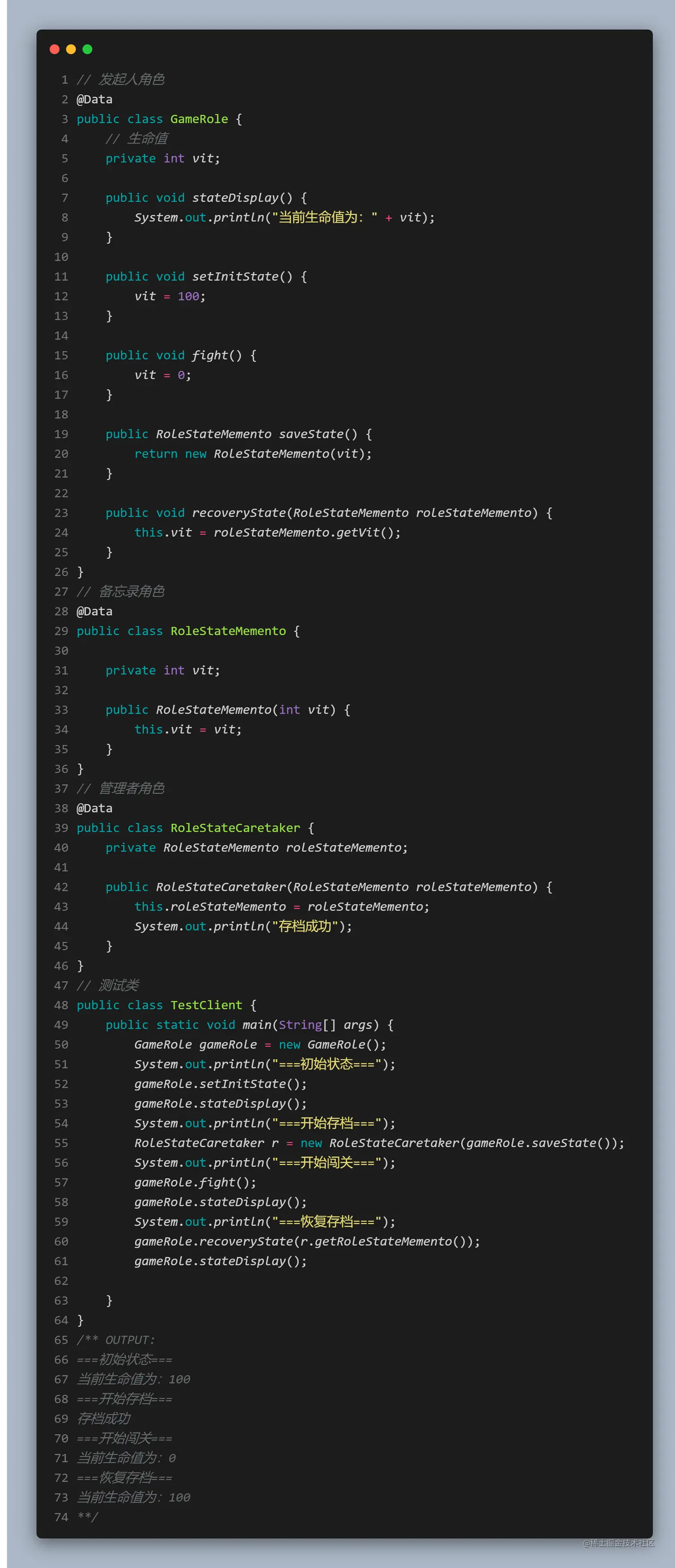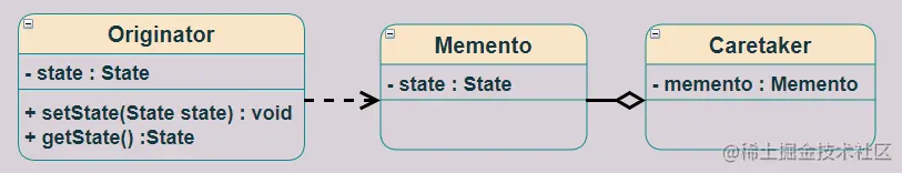 - 管理者(Caretaker)角色: 对备忘录进行管理,提供保存与获取备忘录的功能,但其不能对备忘录的内容进行访问和修改