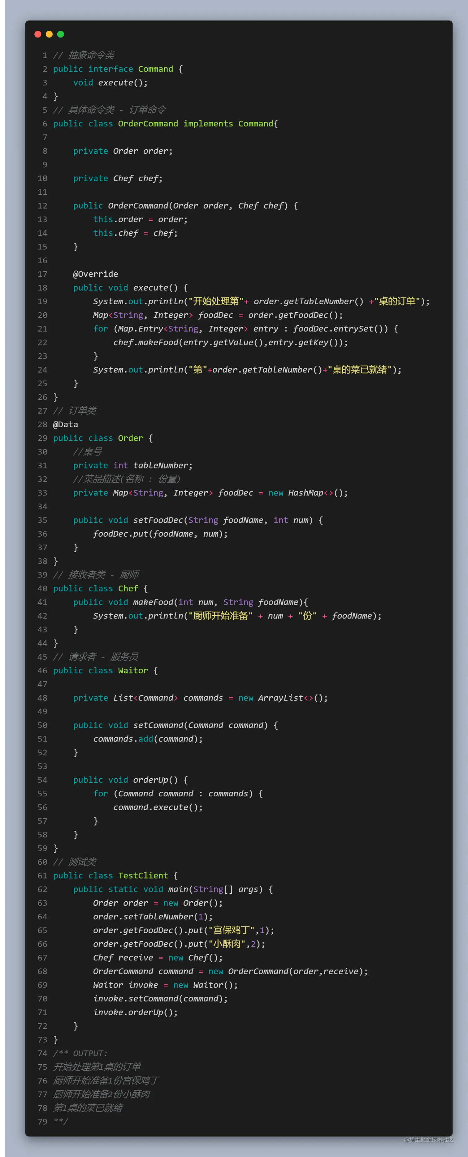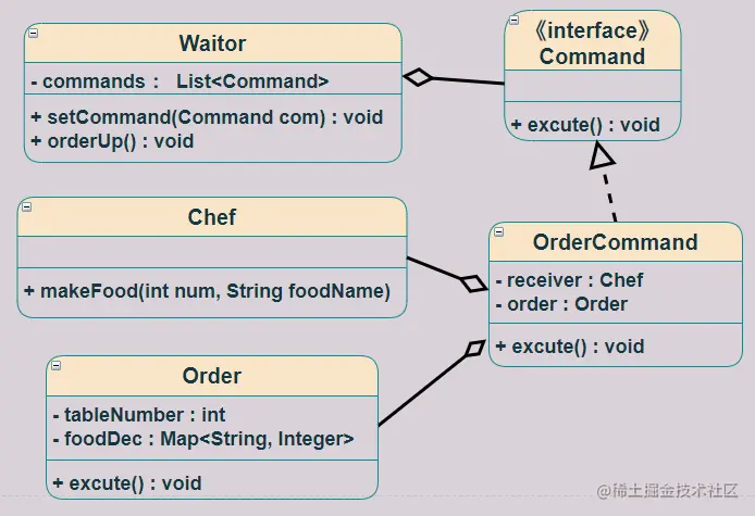 这个过程便是利用了命令模式,将订单作为一个请求封装成对象,将服务员和厨师之间的责任隔开,两者只需要通过订单进行沟通,方便将命令模式进行存储、传递、调用、增加与管理。