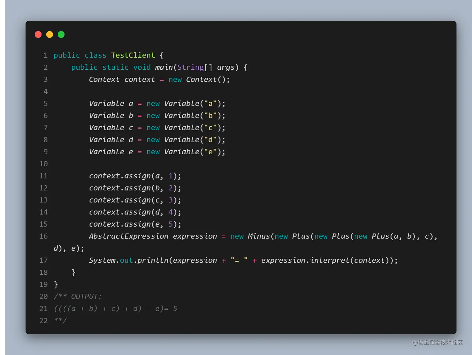 - 非终结符表达式(NonTerminalExpression)角色: 实现抽象表达式,用来实现文法中与非终结符相关的操作,文法中每条规则都对应与一个非终结符表达式