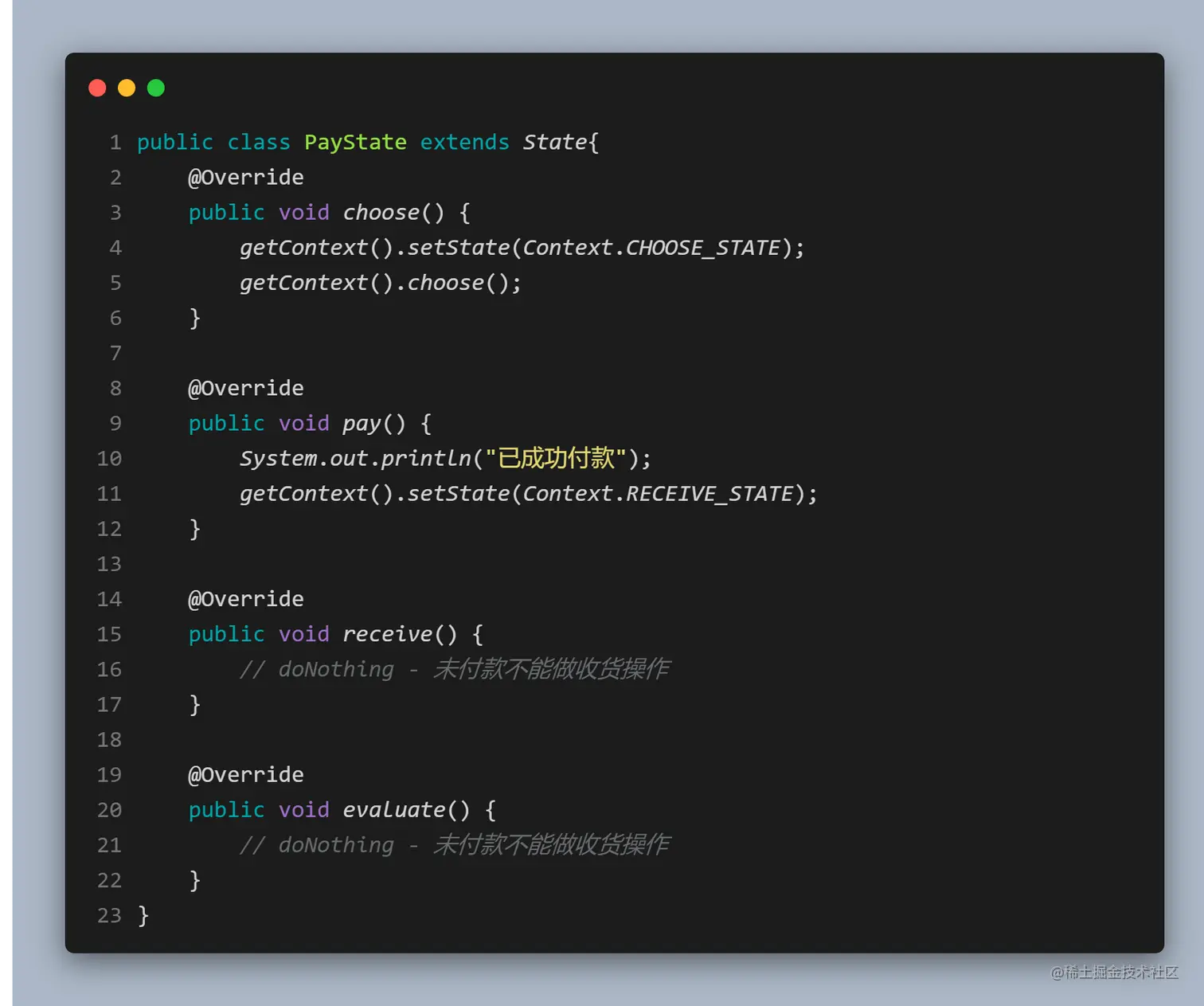 - 环境(Context)角色: 也称为上下文,它定义了客户程序需要的接口,维护一个当前状态,并将与状态相关的操作委托给当前状态对象来处理