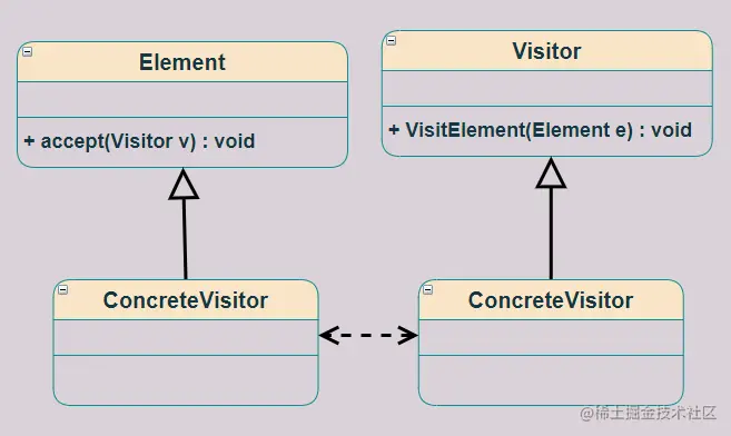 简单来说就是想要为一个对象增强新的行为,且不封装具体的实现,那么就可以用访问者模式。 UML 图如下: