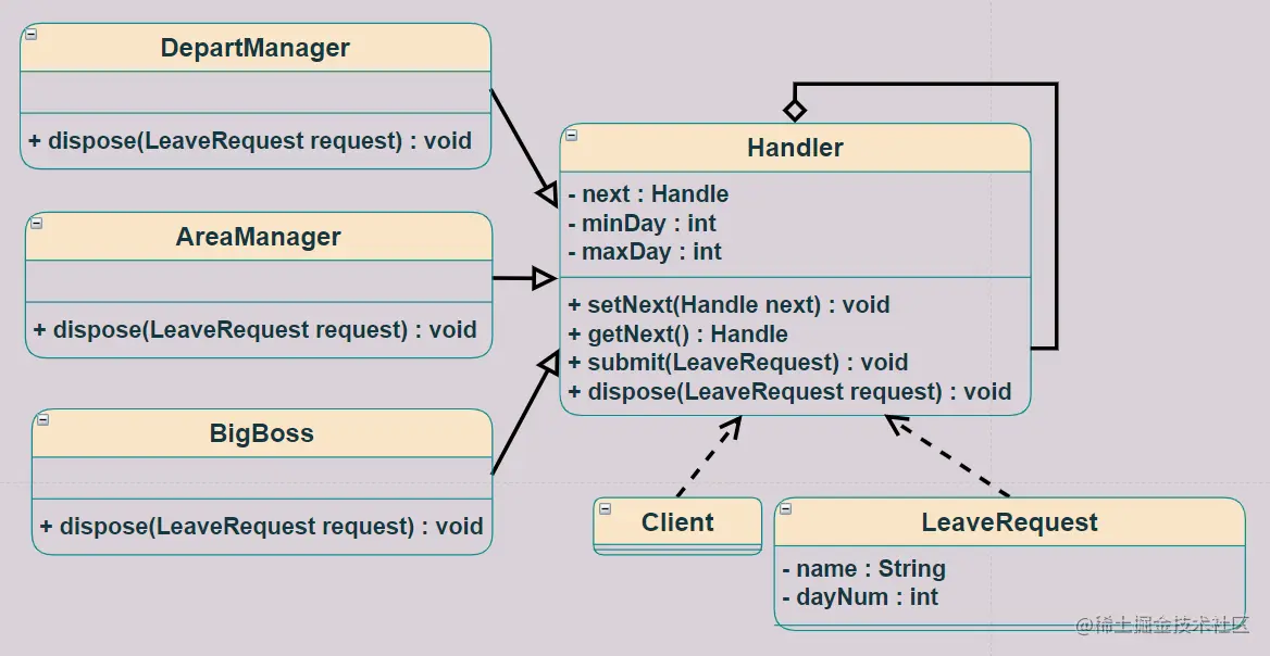 责任链模式 UML 图 与角色关系如下: