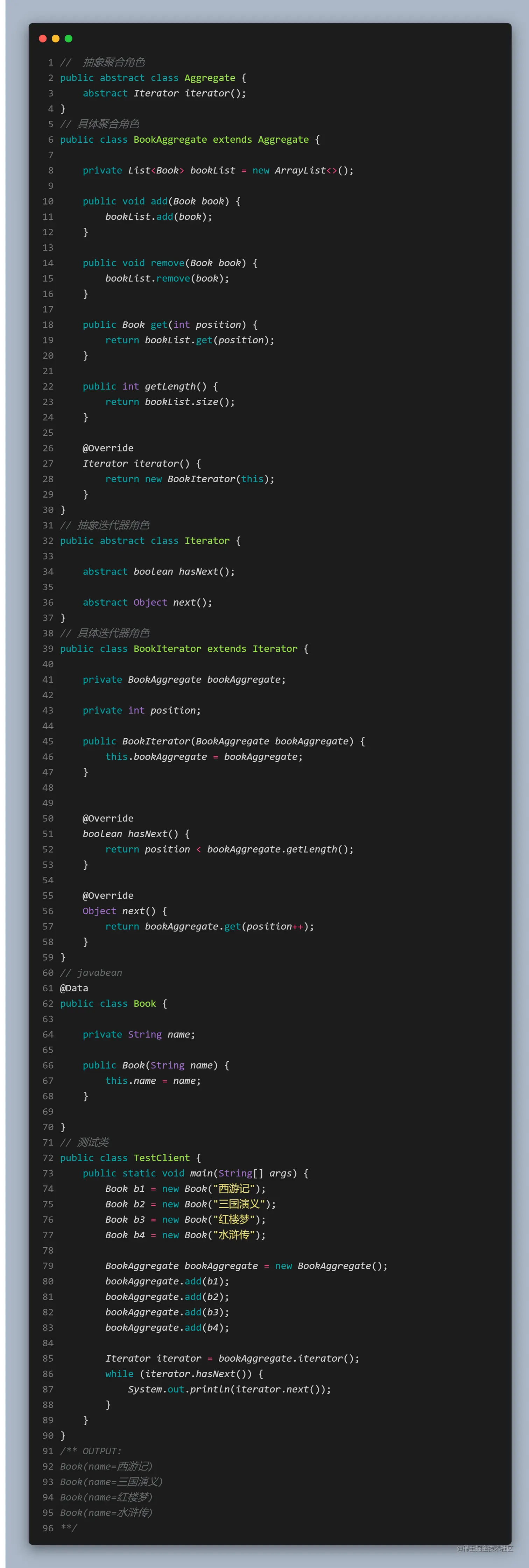 - 抽象聚合(Aggregate)角色: 定义添加、删除聚合元素以及创建迭代器对象的接口