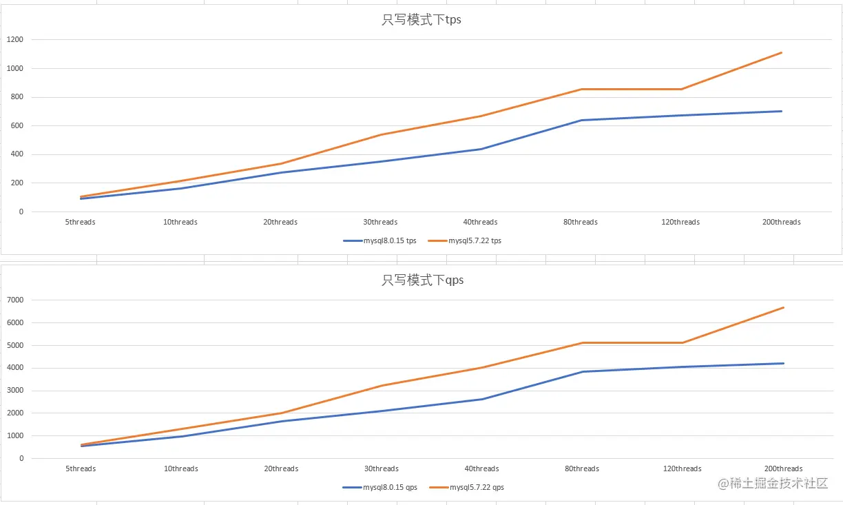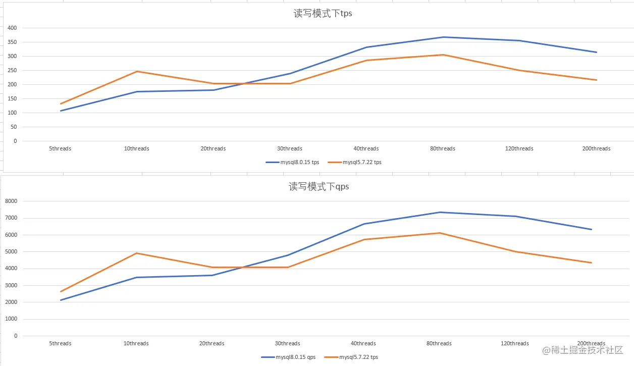 #用于sysbench 测试在读写模式、只读模式、只写模式下 mysql5.7和mysql8.0 的tps,qps
