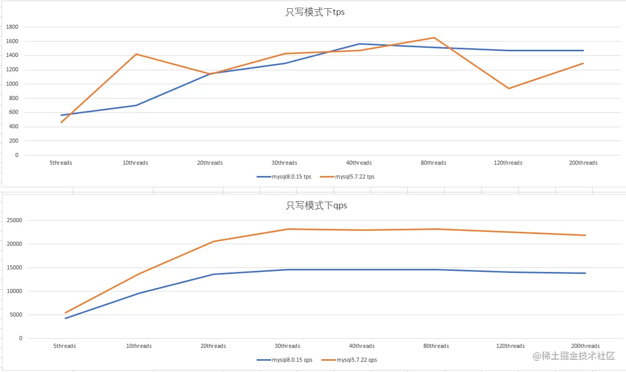 - 双1 配置,只读模式下,mysql5.7.22 的tps、qps比mysql8.0.15 好1/3 左右;并发线程数增加后,tps、qps并没有随着增加,反而出现了下降的趋势