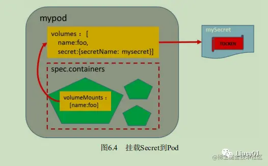 可以通过Secret保管敏感信息,并以Mount方式将Secret挂载到Container中,然后通过访问目录中文件的方式获取信息。