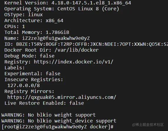 5.查看镜像是否配置成功。使用docker info 命令查看 Registry Mirrors 选项 是否为 aliyun 地址