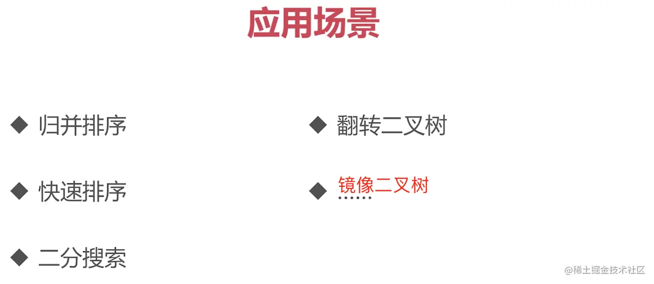 //时间复杂度 每次缩小一半 O(logN) 空间复杂度 递归堆栈 O(logN)