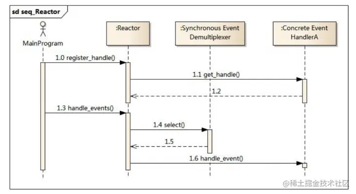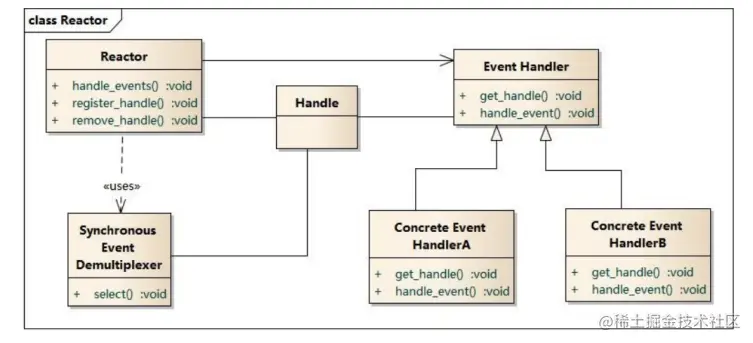 Reactor: 事件分派器,负责事件的注册,删除以及对所有注册到事件分派器的事件进行监控, 当事件发生时会调用Event Handler接口来处理事件。