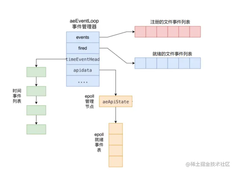 aeTimeEvent结构体为时间事件,Redis 将所有时间事件都放在一个无序链表中,每次 Redis 会遍历整个链表,查找所有已经到达的时间事件,并且调用相应的事件处理器。