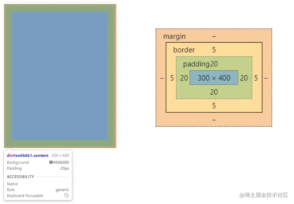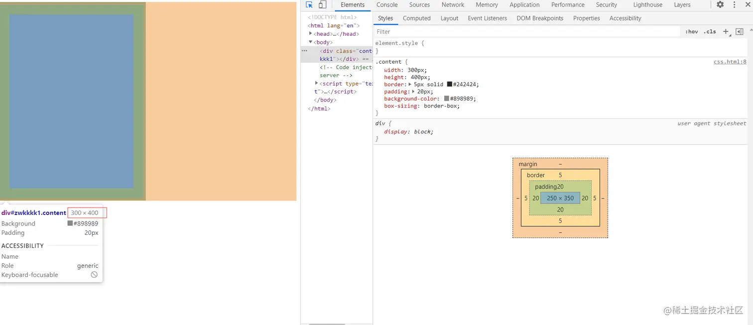 在这张图中,我们发现我们设置的300*400出现在了最里面的那个蓝框中,与此同时我们可以发现在这个盒模型中除了我们设置的内容(content),还有margin(外边距)、border(边框)、padding(内边框)