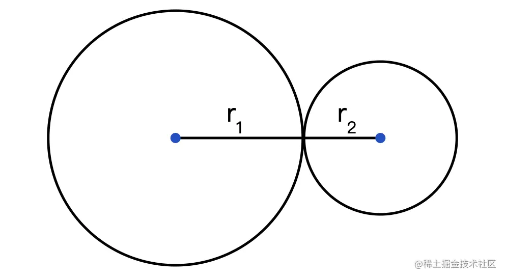 这种简单的碰撞检测背后的数学原理是,两个圆仅在其中心之间的距离≤半径总和时才“碰撞”。 在这种情况下,两个圆心之间的距离恰好是其半径的总和: