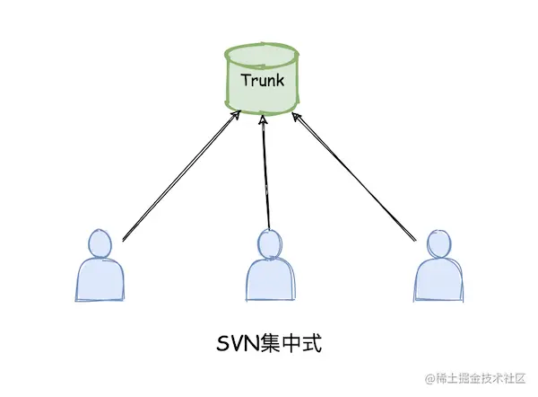 集中式工作流这种工作方式对于使用过SVN的同学想必会非常的熟悉,让我们思考下在 SVN下的协作体验,不同的开发同学需要依次将本地的修改提交到服务器,如果有冲突就先解决本地的冲突再提交,这个过程中远端的服务器就像是一个集中管理者,管理着所有人的代码提交,所以 SVN的开发协作流程就是典型的集中式工作流。