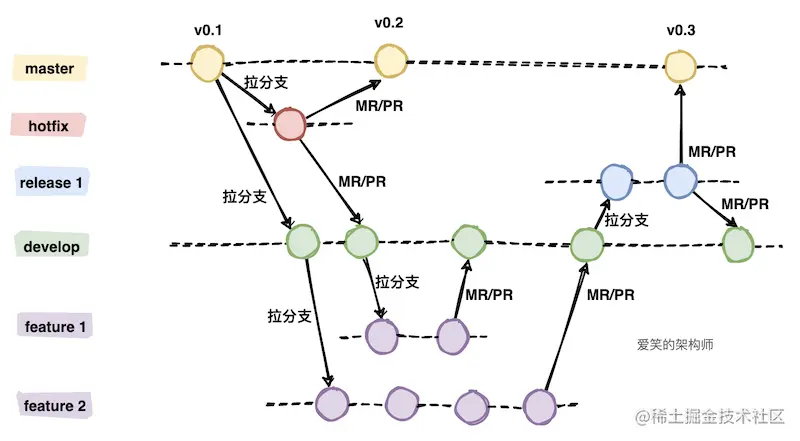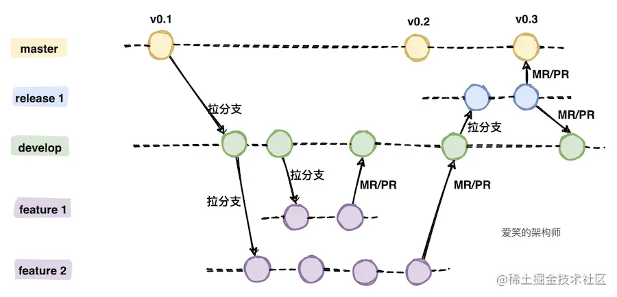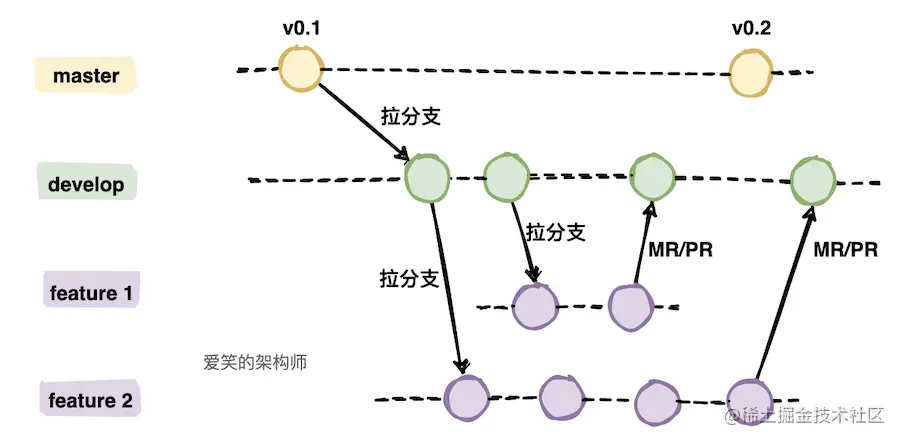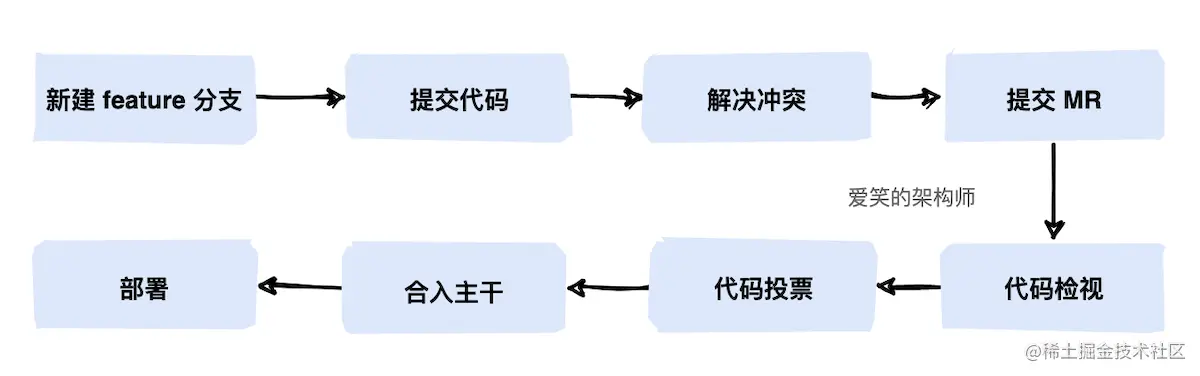 为了便于大家并发开展工作,通常会基于 master 主干分支拉取几个特性分支,每个开发人员关注于自己的分支,需要提交代码时直接提交到本地库的特性分支,在合入到主干分支前通常会拉取最新的代码,如果有冲突先在本地解决好冲突,解决完提交 MR 申请将特性分支合入主干分支。
