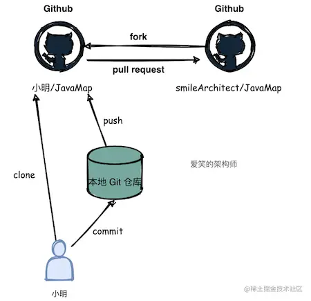 在本地执行 git clone 命令将代码克隆到本地,一顿修改操作后提交代码并 push到个人远程仓库中,然后在界面上发起 pull request,项目的原作者会看到你提交的 PR,根据提交的质量作者可以选择接受或拒绝。