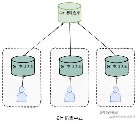每个开发人员将远程仓库的代码 clone 下来变成了属于自己的本地仓库,提交代码时先提交至本地仓库,然后再推送到远程仓库。