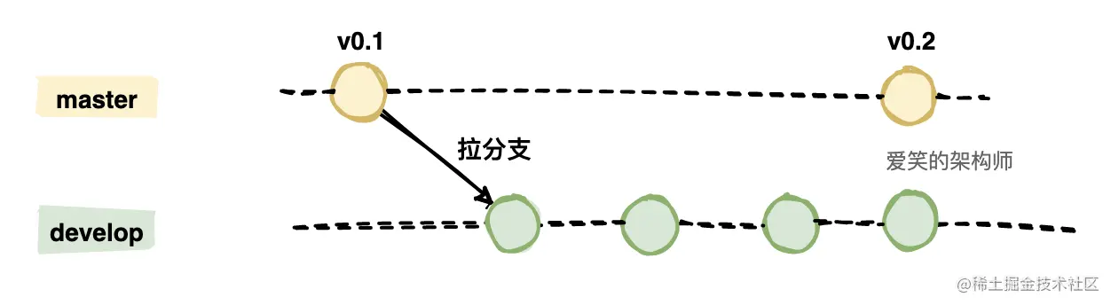 develop 从 master 拉出来之后会独立发展,不会与 master 直接产生联系。