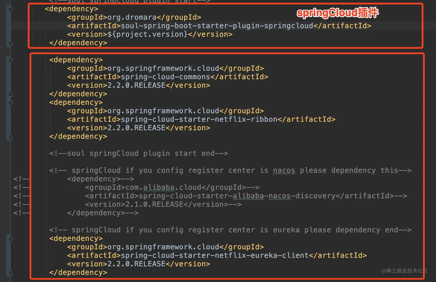 soul-bootstrap添加 Eureka Client、Ribbon、SpringCloud的依赖,默认有只是被注释掉了。 -