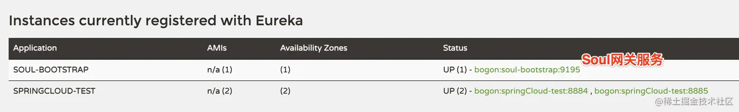 可以看到一个Soul网关服务和两个 http 服务注册到了 Eureka 上,端口为8884、8885。