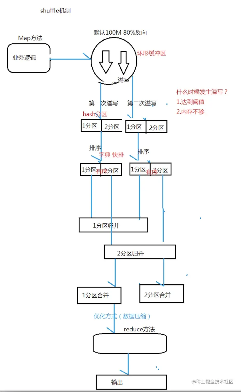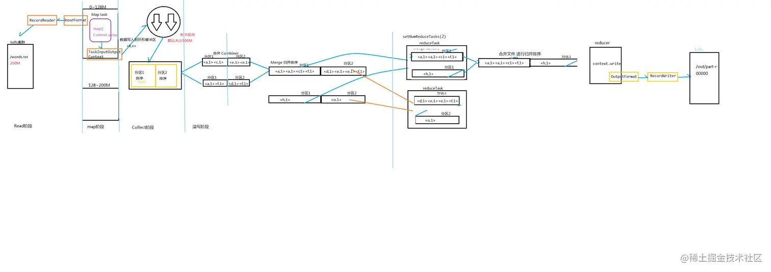 - 5) Merge: 当所有数据处理完成后,Map Task对所有临时文件进行一次合并,以确保最终只会生成一个数据文件。