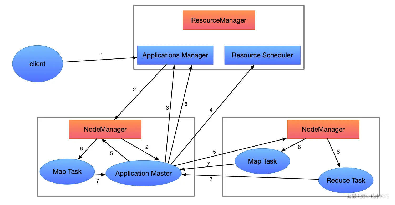 - 1、Client向RM提交应用程序,其中包含Application Master主程序和启动命令。