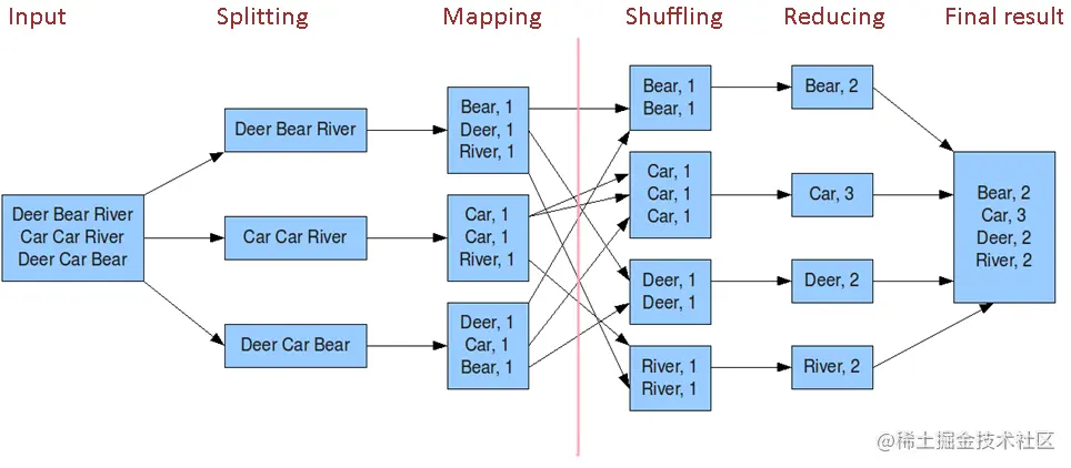 - 5) Write: reduce()函数将计算结果写到HDFS。