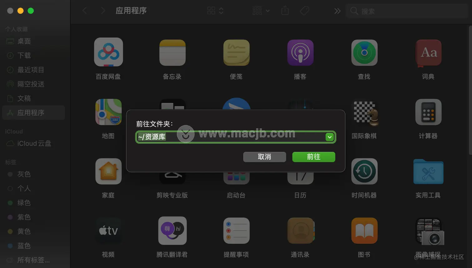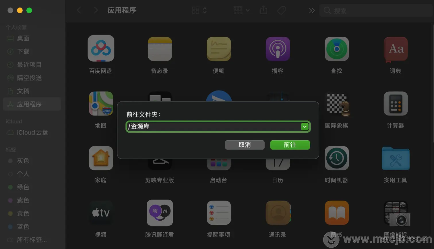 2.在「访达」中,点击屏幕左上角的「前往」-「前往文件夹」,输入 /Library 并确定转到资源库。